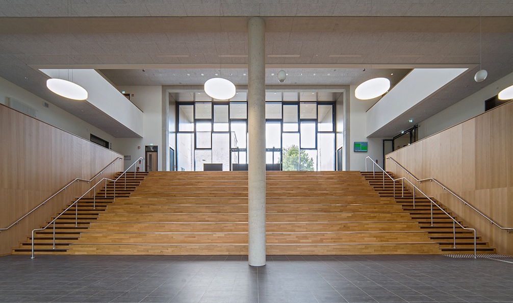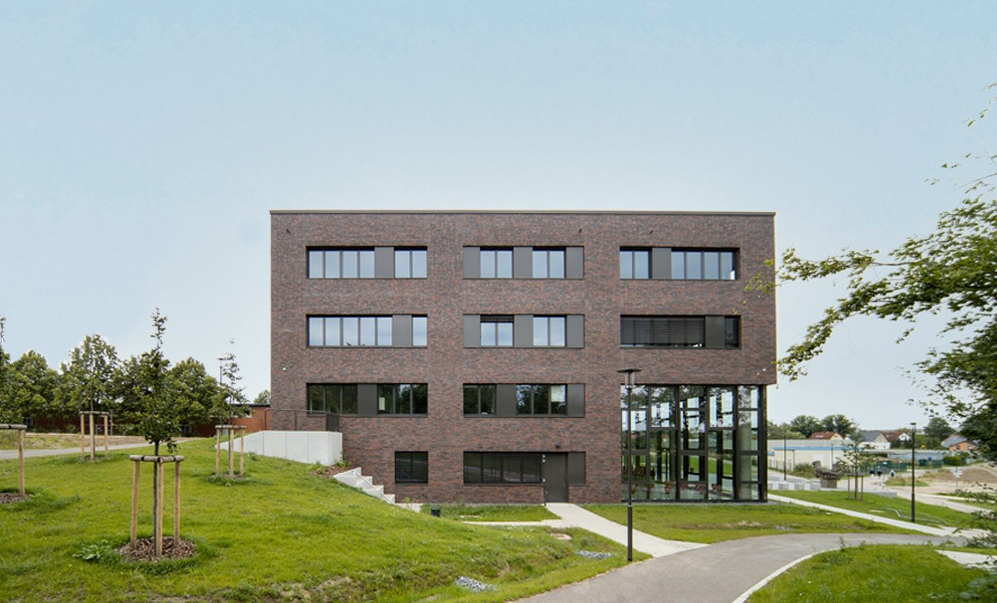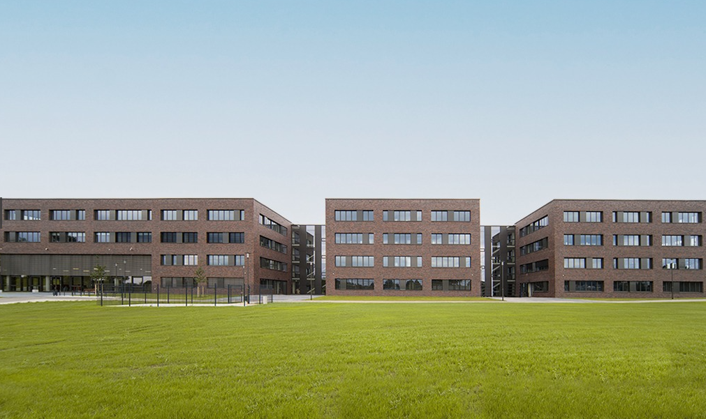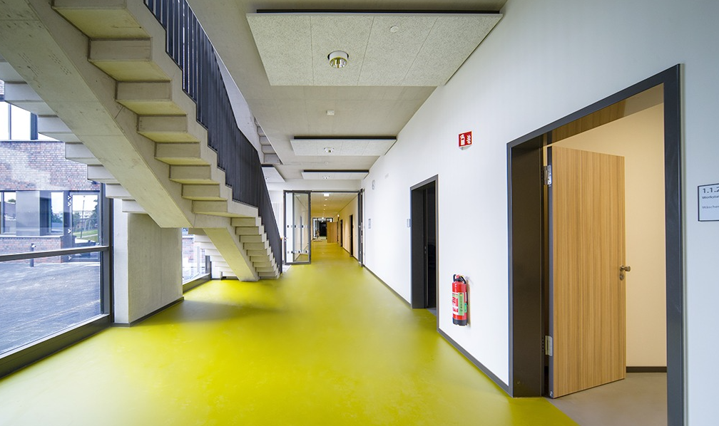 Der viergeschossige Massivbau bietet auf vier Etagen insgesamt 52 moderne Unterrichtsräume, Labore, Werkstätten, Lehrerzimmer,